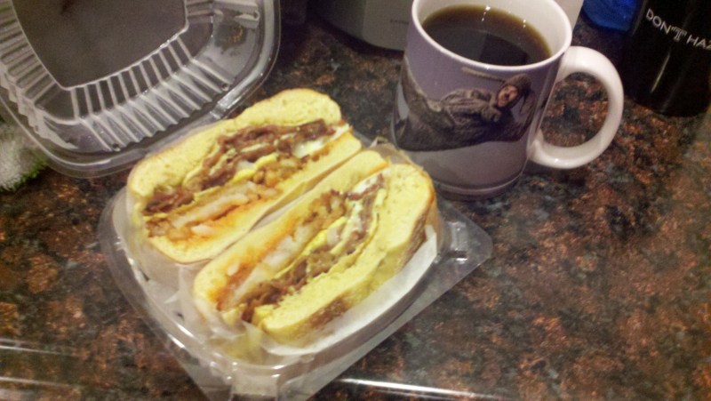 - Some days I’d crave nothing more than a $3.75 cheesesteak (whiz, fried onions) after a long shift at work. If I felt like splurging, maybe a $4.50 chicken finger platter (salt, pepper, ketchup?). And there’s no better hangover cure than a bacon, egg, cheese, and hashbrown ON A BAGEL, with hot sauce. $4.00. Oh yeah.
