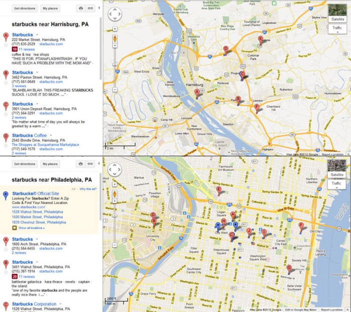 This had to be my last day as a juror. Didn’t make me feel any better about it. Got to “downtown” at 7:45, and needed coffee and checked my phone for a nearby Starbucks. This is where I made an interesting discovery: There’s 1 SB in Harrisburg’s city limits. It is adjacent to the Whitaker Center’s gift shop. There are a grand total of 6 locations on that map (I live in the green circle at the top right, for reference). Whereas there are at least 10 locations in center city Philly alone. Pay close attention to the scale of the maps.