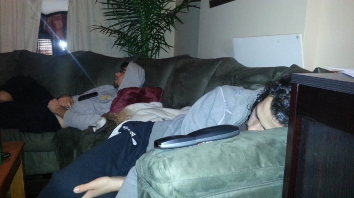 If I didn’t feel like a total creep taking pictures of my sleeping roommates, there’d be much more photographic evidence. Couldn’t pass up an opportunity like this though. If you ever need a place to crash in south Philly…our couch is more than hospitable.